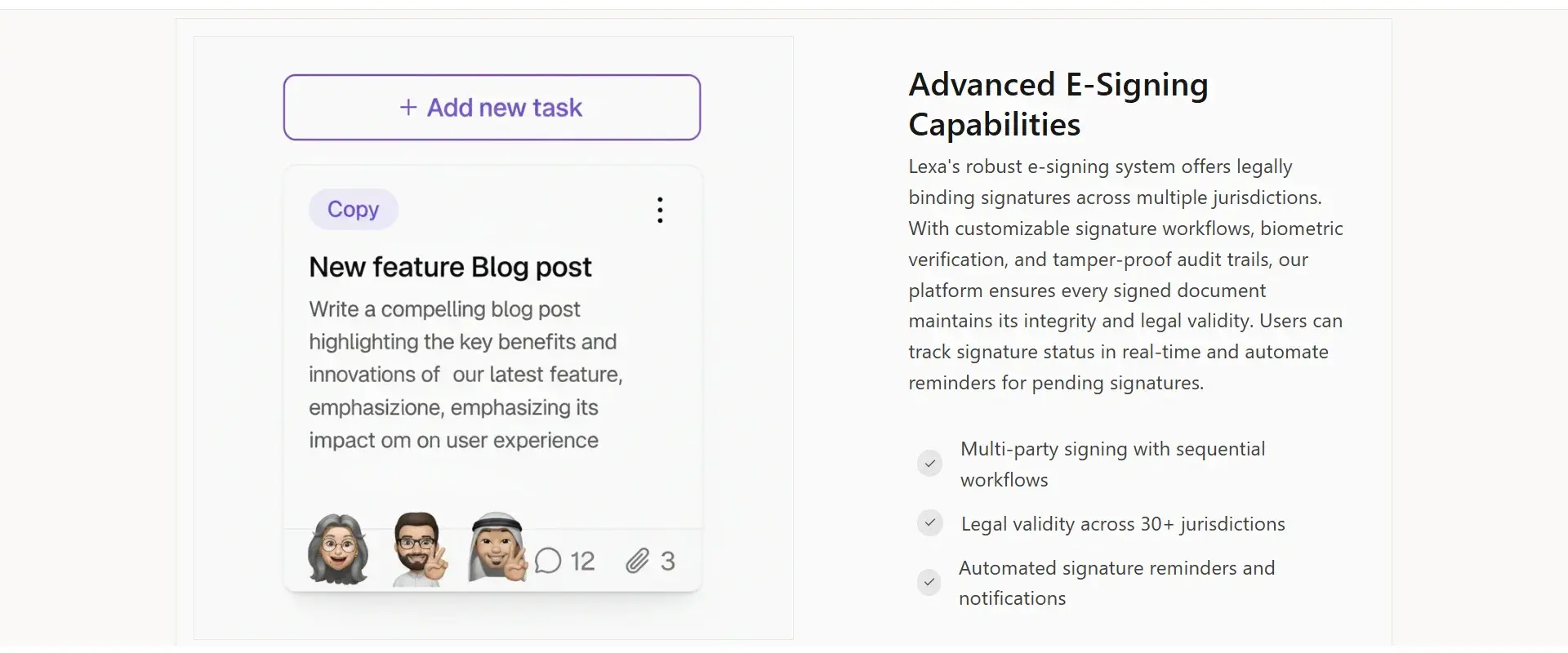 Full-stack Legal SaaS Architecture: We built Lexa using Astro 5.13 with React 19 components, creating a highly performant and scalable legal platform. The architecture includes advanced state management with Nanostores, comprehensive authentication systems, and a sophisticated document management vault. The platform supports multiple languages and includes AI-powered features for contract intelligence and automated workflows. Security and Compliance Implementation: Given the sensitive nature of legal documents, we implemented enterprise-grade security measures including GDPR-compliant data handling, encrypted document storage, and secure digital signature capabilities. The platform includes comprehensive audit trails, version control, and access management systems to meet strict legal industry requirements.